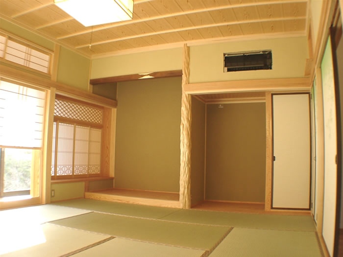 洋風の外観との希望により、正面の3本太い柱で重厚感を出しました。ウッドデッキも広々です。書院が付いた10帖の本格的な和室もあります。